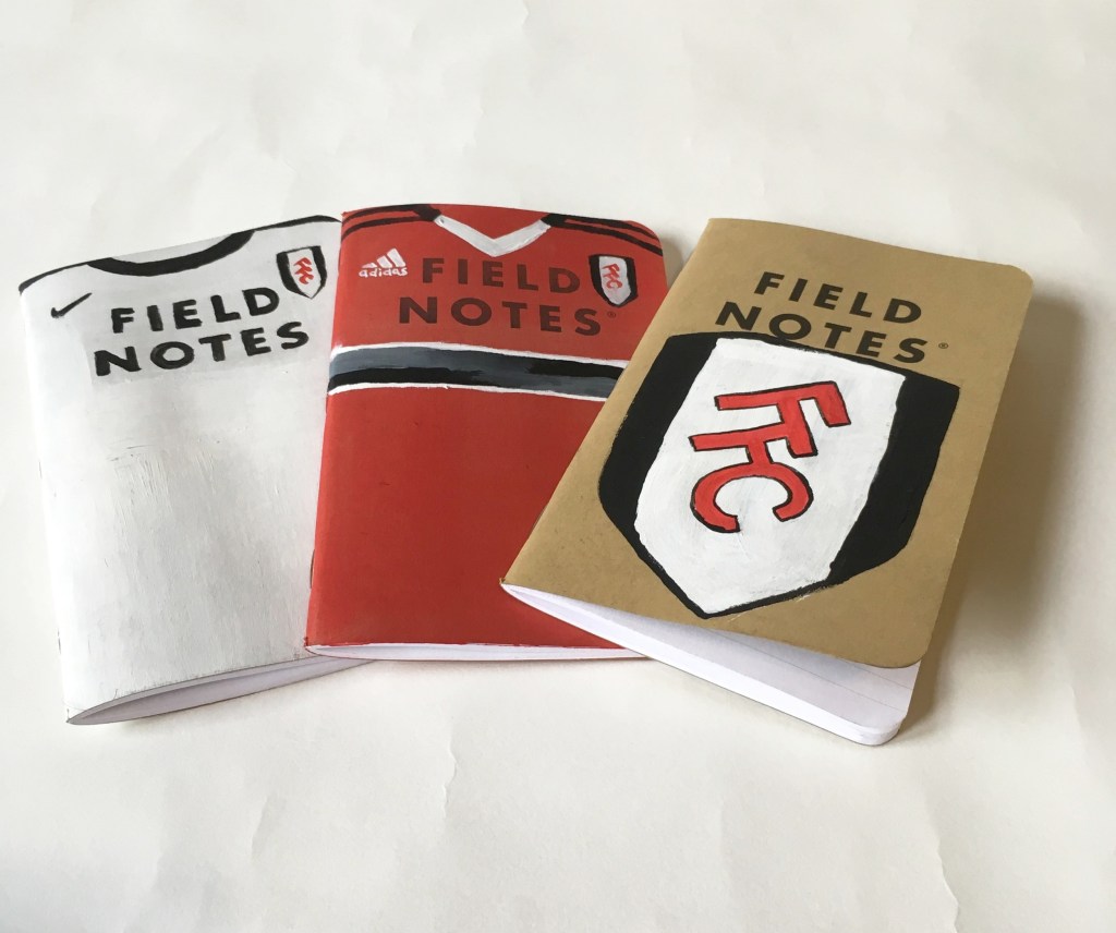 A friend recently commissioned me to paint custom covers for his Field Notes Brand notebooks. My friend was looking for a unique and fun present to give his friend for his birthday. They both use Field Notes regularly and bond over soccer. So we came up with three notebook covers to represent the Fulham Football Club, their favorite team. I made two of the notebooks to look like jerseys and the third has the soccer club’s logo and clubhouse. It was a fun project and I think they make a perfect birthday gift!