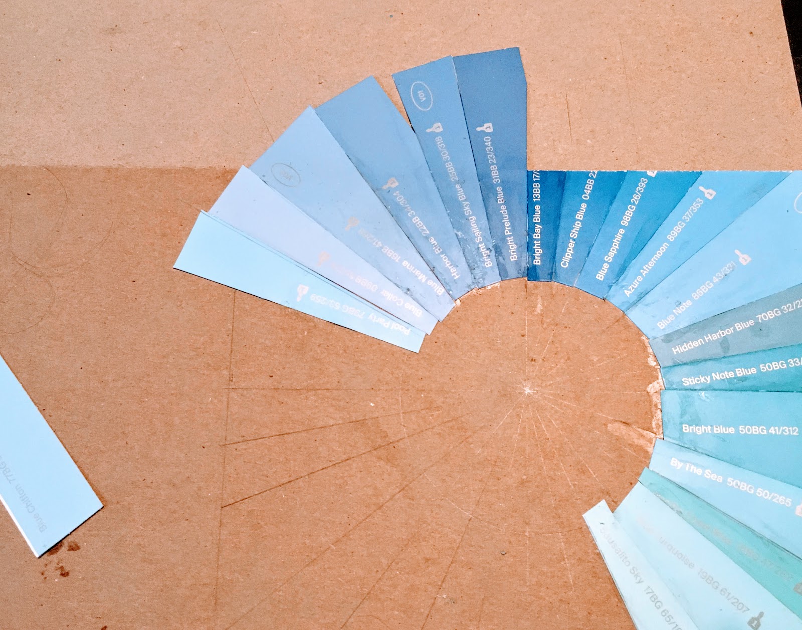 My version is a lot less scientific, but still fun nonetheless! I gathered paint sample cards in varying hues of blue and arranged them as best as I could in some sort of progressive scale. My blues were different hues, as well as tints and shades, so I couldn’t just arrange from dark to light, as some seemed more purple or green.