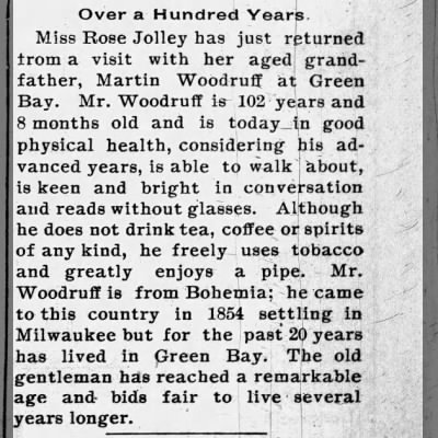I can’t find him anywhere in the census for Milwaukee, or Green Bay. His death doesn’t appear to be noted in the Green Bay newspapers. Why did he move to Green Bay, if his only child lived in Appleton? Does he have other relatives? Is Woodruff even his birth name? If he is from Bohemia, its probably changed to sound more American. What other name variants should I be looking for? Wotruf? Votarov? Vietroff? Watrube?