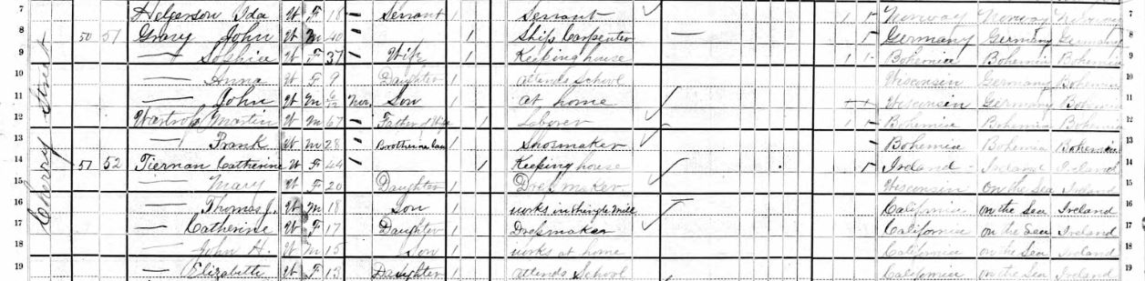 It didn’t take me long to stumble across a Catherine Tiernan at 339 Maple Ave. She would have been a close neighbor to the Woodruffs at 334 Maple Ave, possibly right next door. I then searched through the 1880 Census a second time, looking for her name instead. I found her right away and in the lines right above her name I found Martin Woodruff!