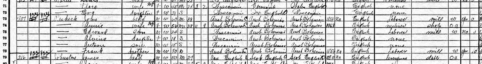 Frank Peshek is my 3rd great-grandfather, father to Rose Peshek-Jolley, my 2nd great-grandmother. Rose’s mother, Mary Woodruff, divorced Frank Peshek sometime after Rose was born in 1882 and remarried Frank Joseph Jolley, who then adopted Rose. I’m intrigued by the story there. Mary and Frank had six other children together between the years 1863 to 1879, before they were divorced. Their children are Sophia(1863), Frank(1868), Mary(1869), John Albert(1872), William(1875), and Robert James(1878). Frank never remarried.