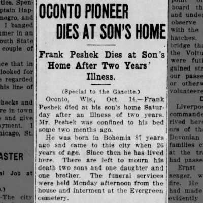Frank and his family lived in Milwaukee, where he met and married Mary Woodruff. The family moved to Green Bay sometime in the 1870s. Frank worked various jobs throughout his life as a laborer, huckster, and drayman. After his divorce, Frank moved to Oconto, Wisconsin, a town north of Green Bay. I found Frank Peshek in the 1910 Census living with his brother, John Peshek. He died in 1913, at the home of his son Robert James Peshek, in Wausaukee, Wisconsin and is buried at the Wausaukee Evergreen Cemetery.