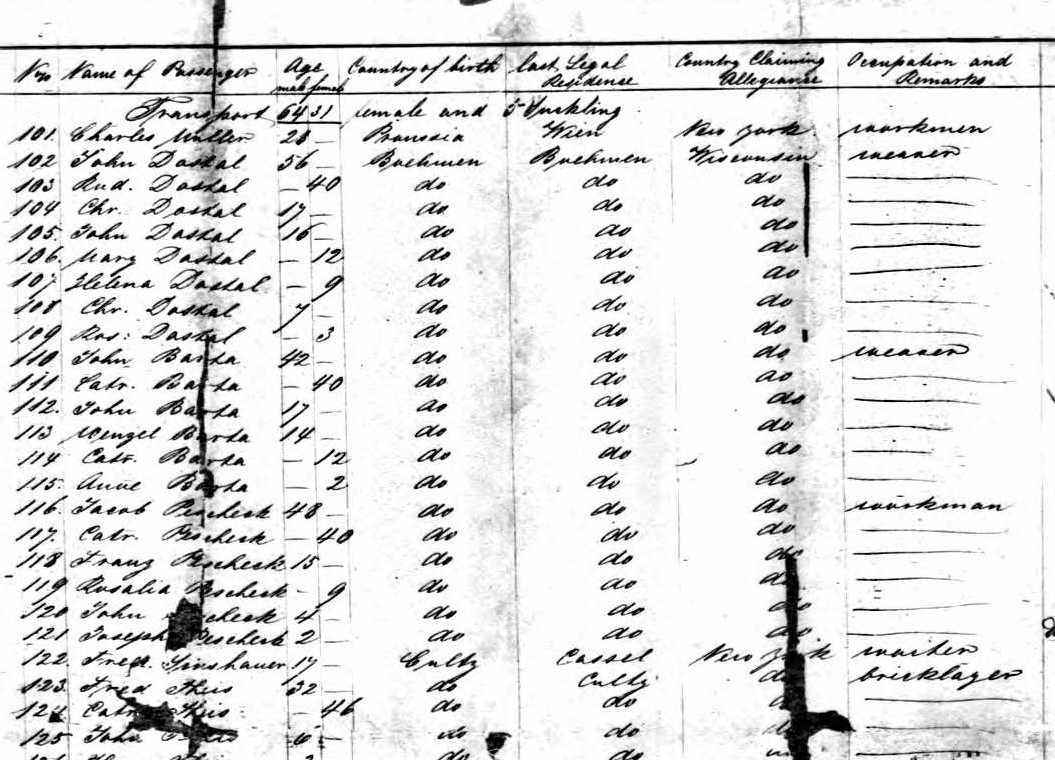 Frank Peshek was born in Bohemia around the year 1840. In 1854, at the age of 15, Frank sailed to America, with his parents and siblings. They sailed on the passenger ship, Clio, from Bremen, Germany heading to Wisconsin. Frank’s parents are listed as Jacob and Cat?, and siblings Rosalia, John, and Joseph.