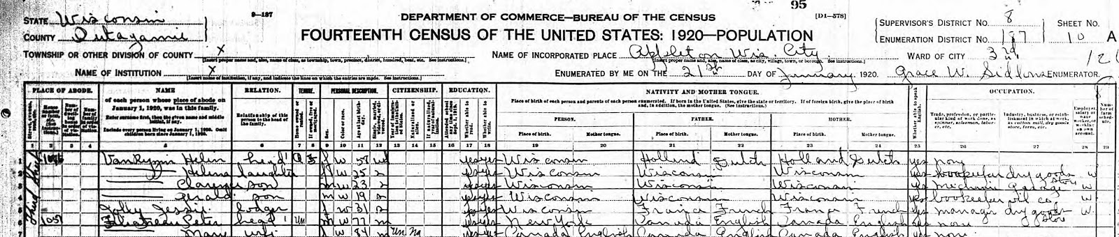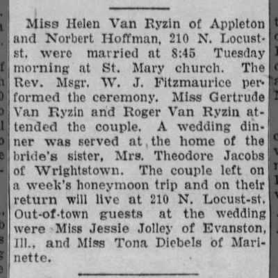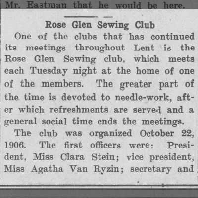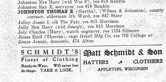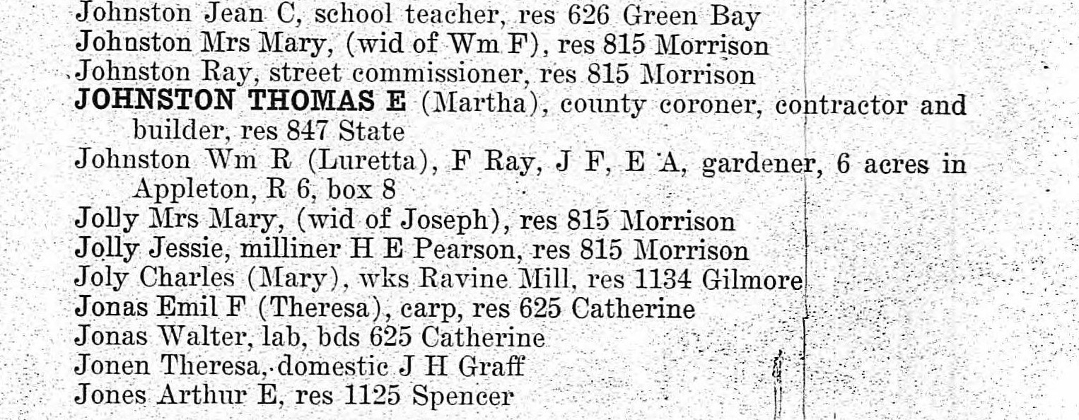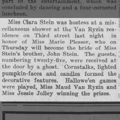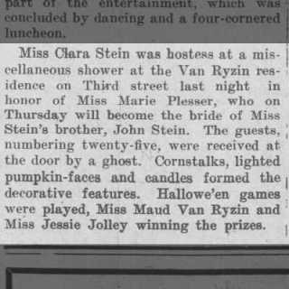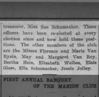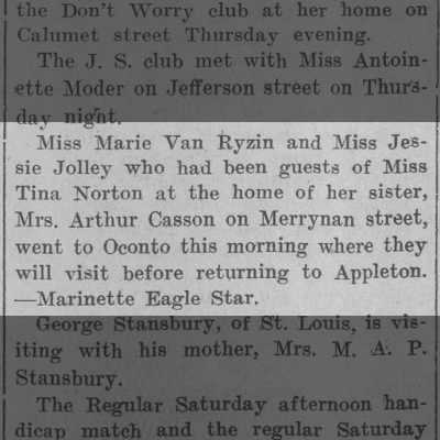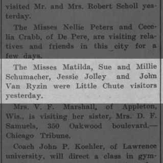 While researching the Jolleys, I came across Jessie mentioned in the Appleton Post-Crescent social pages at least 15 different times! She was always either visiting friends and relatives, or attending parties and functions. When she isn’t working to support herself and her mother, Jessie had a lively and active social life. Her friends included the Misses Matilda, Sue, and Millie Schumacher, John Van Ryzin and his sisters, Helen and Marie Van Ryzin, Lillian Taggert, and Clara Stein.