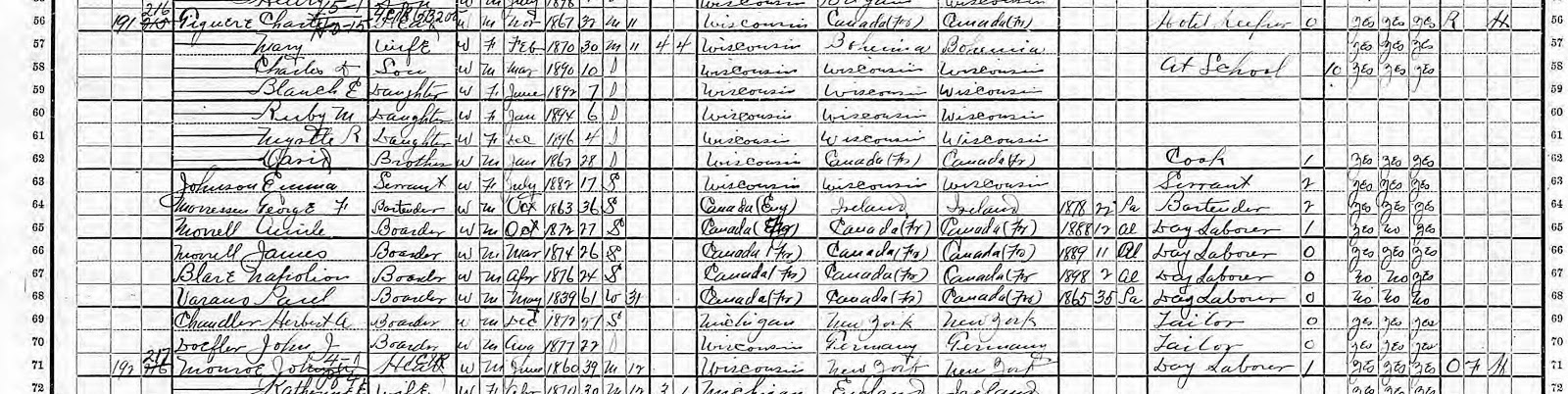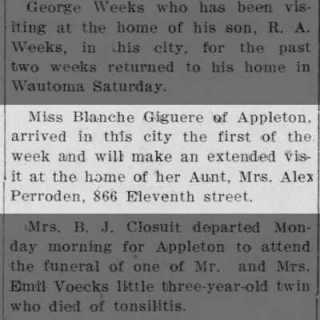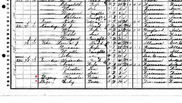 Charles dies October 4th, 1905 and Mary Peshek soon follows in December. Charles was only 37 and Mary 36 years old. What caused them to die so young? and die only months apart? Where do the Gegay children end up after the sudden deaths of their parents? I’m unable to find any more documents for their son Caharles D. The years 1905-1910 are a mystery, until we find the daughters again, in the 1910 Census. Blanche and Ruby live with their aunt, Rose (Peshek-Jolley) Perrodin in Wisconsin Rapids.