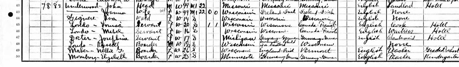 But where is Eva Murial? After some digging, I found an Eva Giguere listed, in the 1910 Census for Wausaukee, as a ward to John and Joanna Underwood!