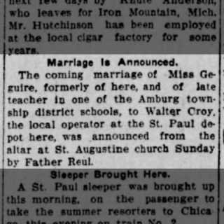 Mary Peshek married Charles F. Giguere on August 8, 1889, in Oconto, Wisconsin. They had four children, Charles D., Blanche Ellen, Ruby Mary, and Eva Muriel. Charles is listed as a hotel keeper in the 1910 Census. Charles’ brother David worked at the hotel as a cook.
