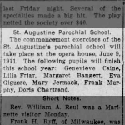 John Underwood owned and operated the Exchange Hotel in Wausaukee, from 1888 until it burned down in 1911. That same year, Eva graduates from the local school, St. Augustine’s.