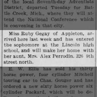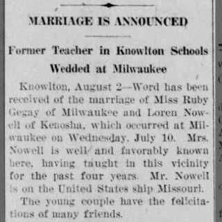 Ruby and Eva continue to teach in the rural schools of the Wisconsin countryside, and visit family all over Wisconsin whenever they have vacation. Ruby marries Loren Nowell July 10, 1918 and they eventually move to Florida. Eva continues teaching until she marries George J Altenburg, sometime between 1920-1925. And that’s the story of the Gegay sisters who, although they lost their parents, gained family all over Wisconsin and kept the Peshek, Woodruff, Perrodin branches connected.