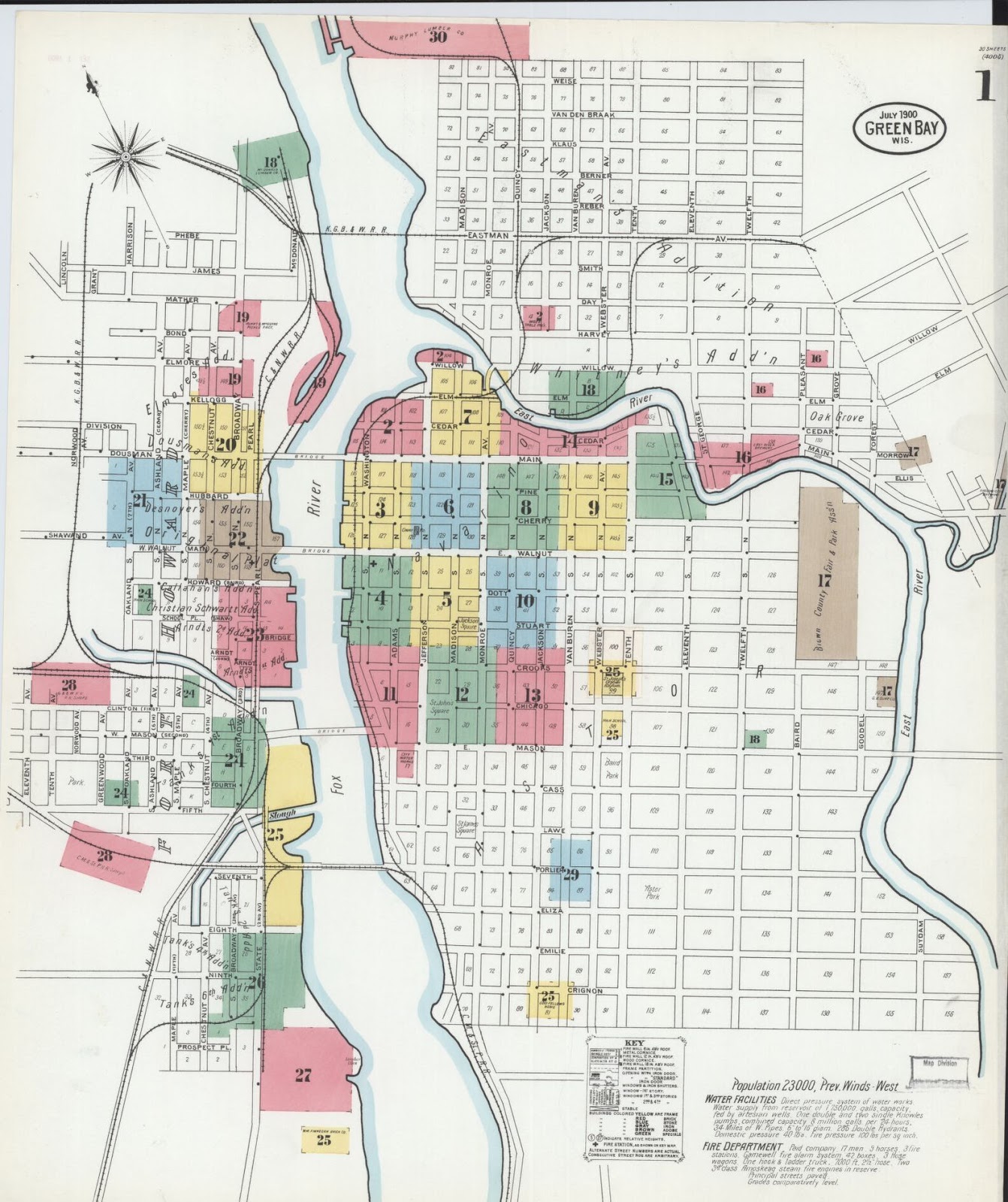 Green Bay is located on Lake Michigan in Brown County, Wisconsin, at the mouth of the Fox River. The Menominee, Ho-Chunk, and other native peoples inhabited the area for at least 10,000 years, drawn to the area’s rich soil and abundant fish, wild rice, and waterfowl. The earliest reliably documented contact between Europeans and Indians in Wisconsin was in 1634, when French explorer Jean Nicolet (1598-1642) met the Ho-Chunk, followed by missionaries Claude Allouez (1622-1689) and Jacques Marquette (1637-1675). The French named the area “La Baye,” and it served as the main point of entry into the continent’s interior. In 1763, the British ousted the French and took control of Green Bay until 1783, when the Americans won control in the American Revolution.