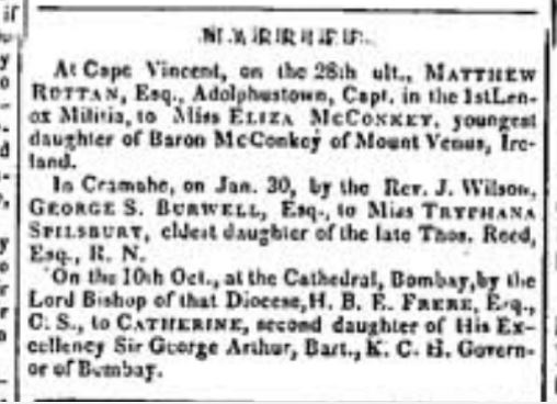 On Jan 28th, 1845, he married Eliza Ann McConkey, daughter of Baron McConkey of Mount Venus, Ireland. The excerpt is from the Kingston Chronicle & Gazette dated Feb 19th, 1845, it reads, “At Cape Vincent, on 28th ult.(=preceding month), Matthew Ruttan, Adolphustown, Captain, First Lenox Militia, to Eliza, youngest daughter of Baron McConkey, of Mount Venus, Ireland.”