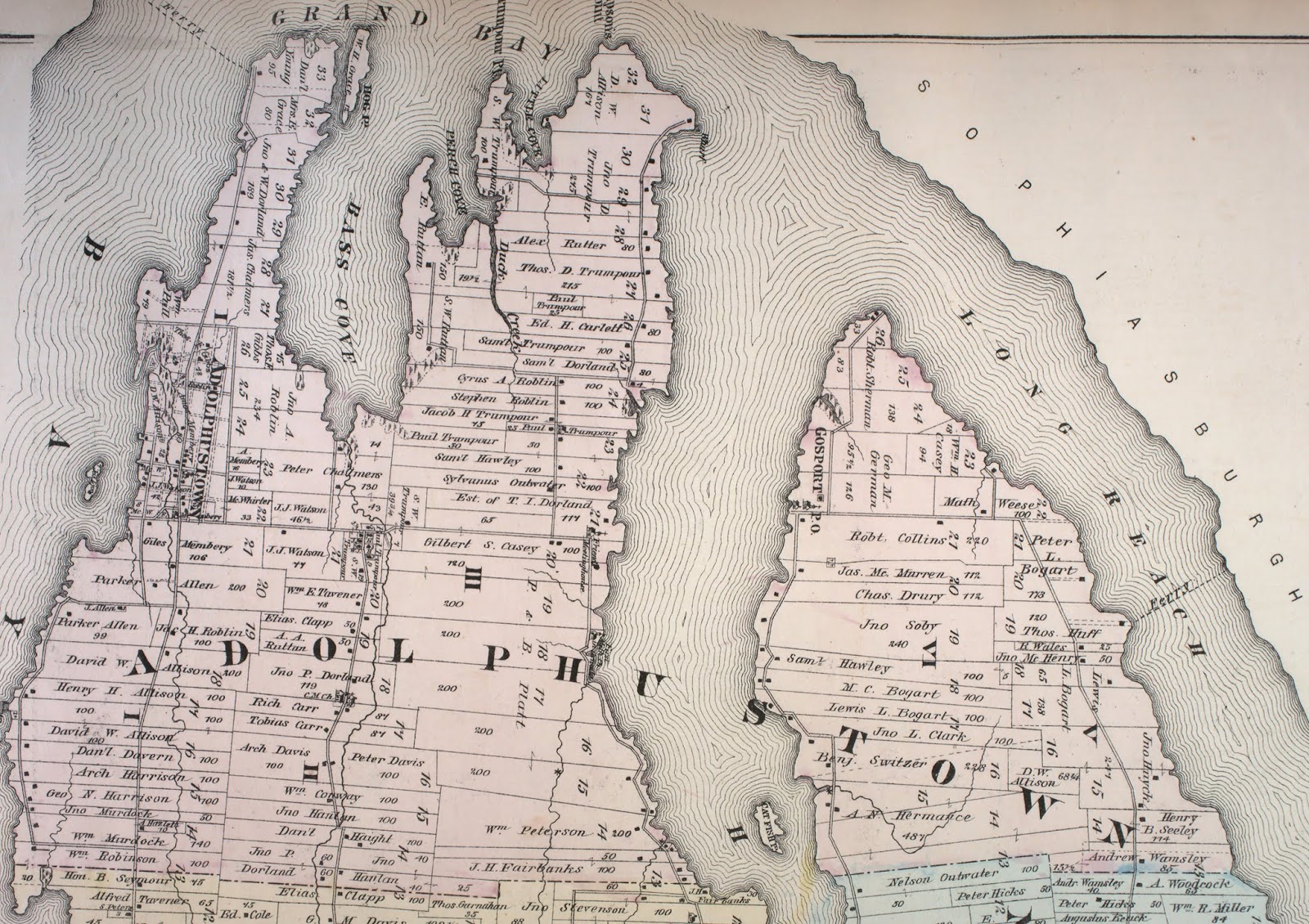 The township of Adolphustown lies in the south western portion of the county of Lennox, is triangular in shape, being bounded on the south and west by the Bay of Quinte, and on the north east by the townships of north and south Fredericksburgh, and at its south western extremity is a Ferry across the Bay to Prince Edward Island. The land is generally rolling, the soil a stiff loam or clay, and the lumber principally hardwood, with a little pine. There are some good farms in the township, and it commenced settling about the year 1784, land being obtainable at that time for a shilling an acre. It rose gradually in value, and in 1817 was stated to be worth for cleared land, four pounds per acre. In 1850 the township contained 690 inhabitants, and 801 in 1861…” from the Mitchell & Co.’s general directory for the city of Kingston and gazetteer of the counties of Frontenac, Lennox and Addington for 1865 Toronto : Mitchell & Co., Publishers, 1865.