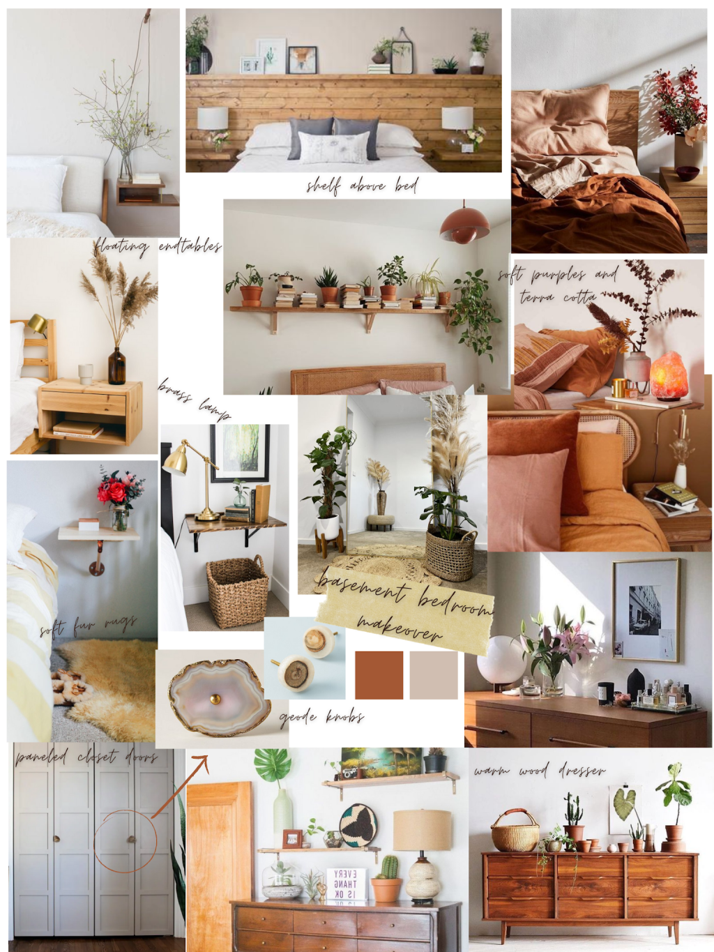 Thankfully, the bedroom was already a finished room when we moved in, with a door, closet, and drywall. It was painted the loveliest shade of lavender, very soft and relaxing. After completing the floors we moved in to the bedroom right away. Its the perfect size for our queen bed with plenty of room on either side to walk and room for a dresser and rug. The bedroom is in the southeast corner and shines all day with bright, natural light. I’d like to accent with terra cotta colors, wood, and brass. For textures I would love to incorporate basketry, linen bedsheets, and fur rugs. And of course, lots of plants! There is a few things that need repair. The outlets and the bedroom door need to be replaced. One of the windows has a broken window pane. The closet needs doors as well.