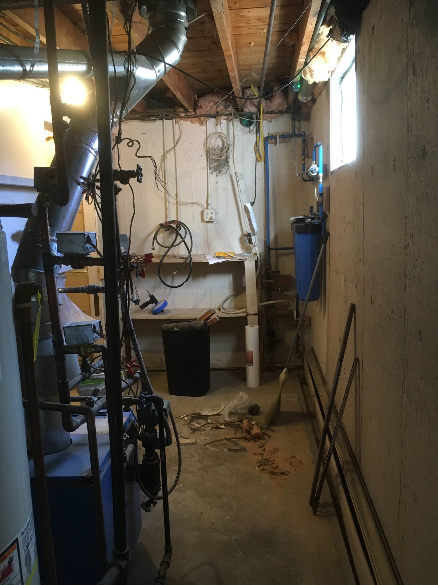 The toilet is going in under the stairs and we have a very basic plastic slop sink that will do for now. The layout makes it almost impossible to completely hide the furnace and water heater, without blocking a window or door, so we’re not even going to try. I’m just going to clean it up to look shiny and new and go for an industrial look, with exposed pipes and ceiling.