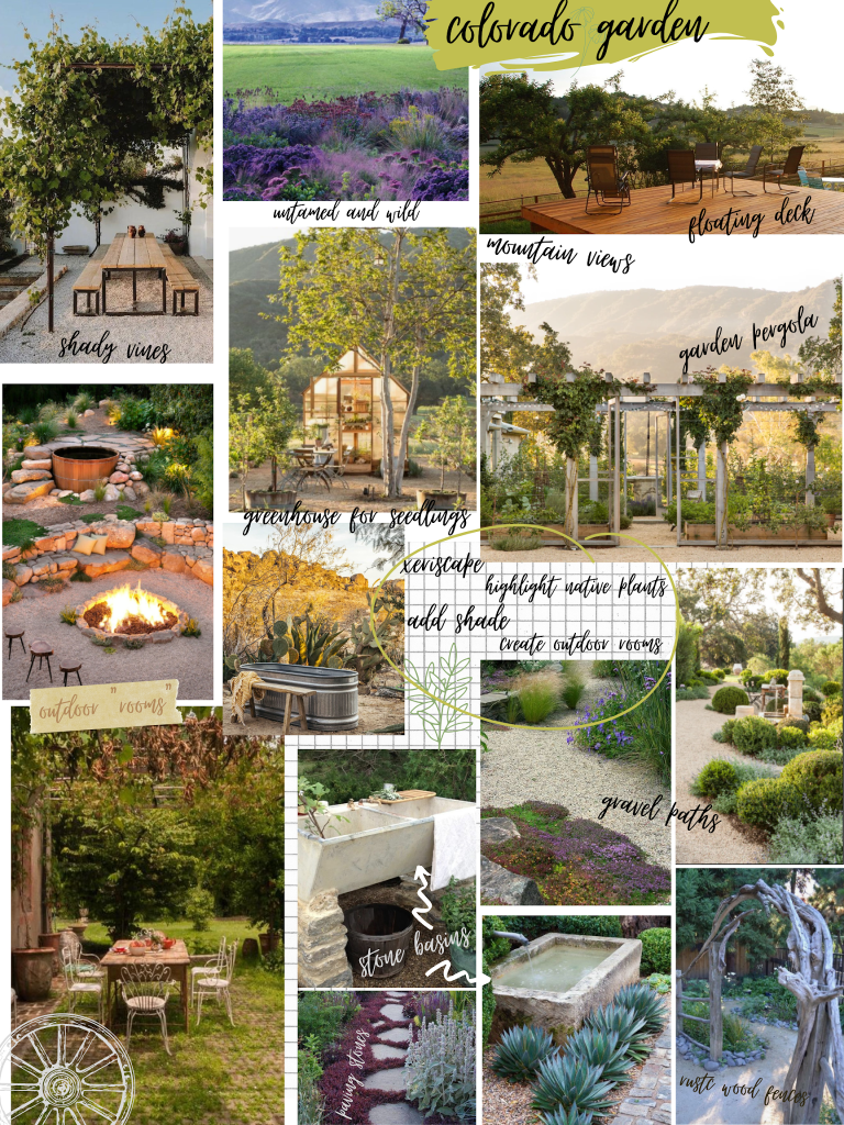 Colorado is very dry and sunny. IT’s important to choose plants that will thrive in our environment. There is no point in wasting energy and resources to recreate a “cottage” garden style or anything lush. We just don’t get enough water or shade. I’m looking for inspiration from other arid climates, like the Mediterranean or Southwest. Right now, the land is open and exposed to the elements. The fruit trees planted here years ago are stunted and need more protection and companion plants. The yard is just a dusty dirt pad in some areas. The earth is severely compacted from years of cars driving every which way. The views though! Mountains on every side! The important features we need to focus on: