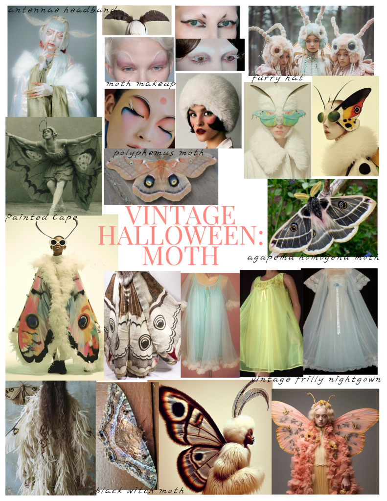 I would like to hand paint the cape to look like moth wings and go all out with the makeup. I’d like the makeup to be slightly weird and strange, otherworldly and alien, to evoke the terror I get from moths. And of course one can’t forget the feathery antennae and bug eye sunglasses!